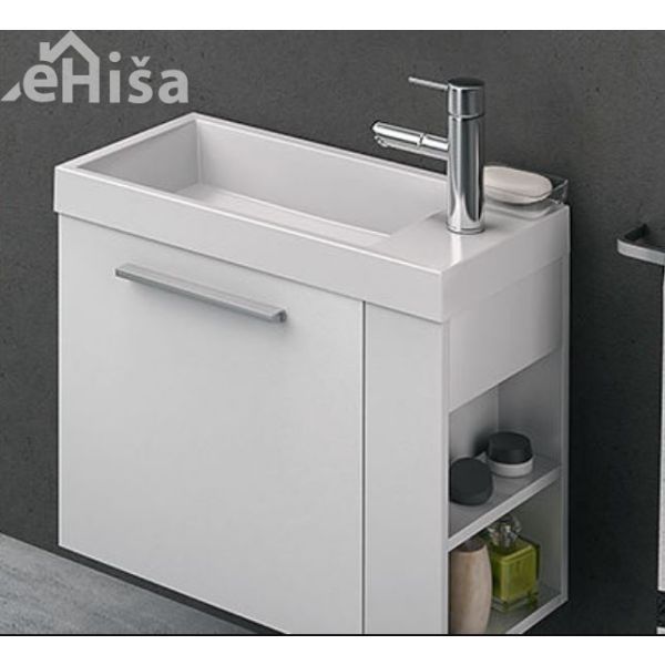 Kopalniška omarica z umivalnikom z vrati spredaj in poličko na desni širine 40 cm na voljo v beli (WH) in craft wood (CW) barvi.